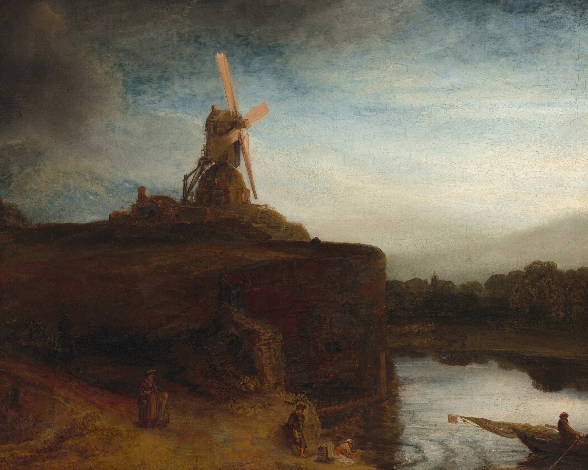 Rembrandt’s masterful use of light and shadow gives the scene a peaceful yet powerful presence. Soft golden highlights break through the clouds, illuminating the mill and the gentle figures below, while rich, moody tones create depth and atmosphere. There’s a quiet stillness here, as if time itself has slowed to a calm, thoughtful pause.